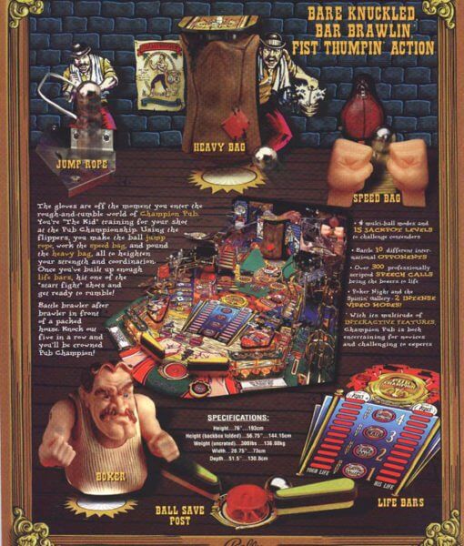 Champion Pub is a great boxing themed pinball machine. The goal is to advace through rounds by knocking out opponents to become the Pub Champion. Only a few of these machines were made.