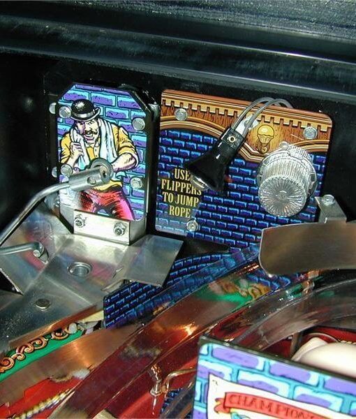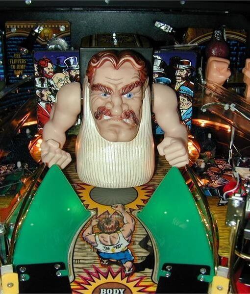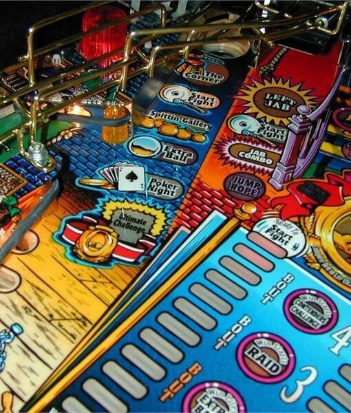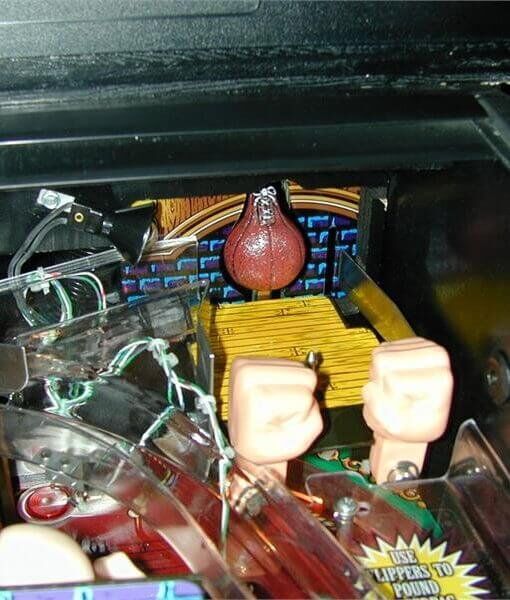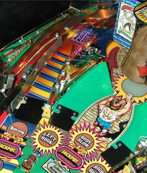 Features a punching bag that rotates 180 degrees to reveal the top half of a boxer who waves his arms up and down. A pair of ramps guide the ball to hit the figure on both sides of the face, and shooting between the ramps lands a “body blow”. Also features a mini-playfield in which the ball is launched at a speed bag by plastic fists instead of flippers, and a “jump rope” which is comprised of a rotating wire that the ball must jump over using a button-controlled solenoid.