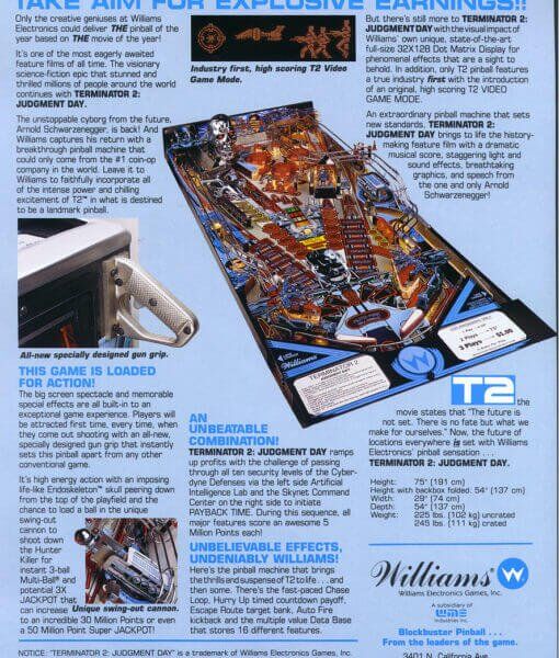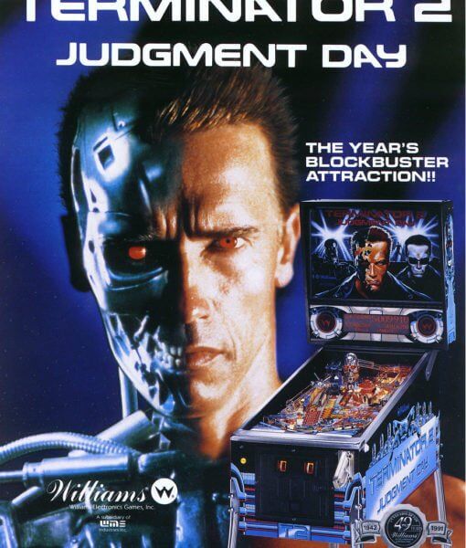 Terminator 2 pinball machine was designed by Steve Ritchie and released by Williams Electronics. It is based on the popular movie.