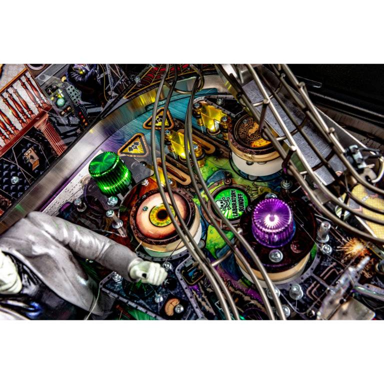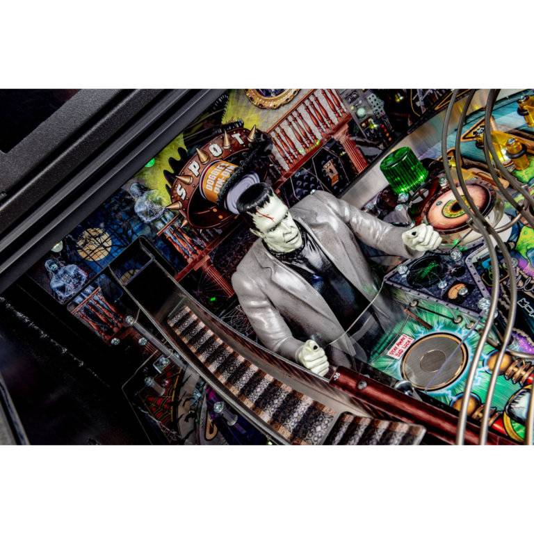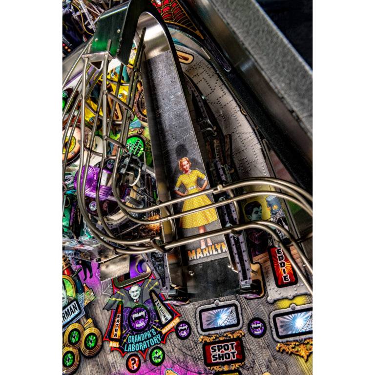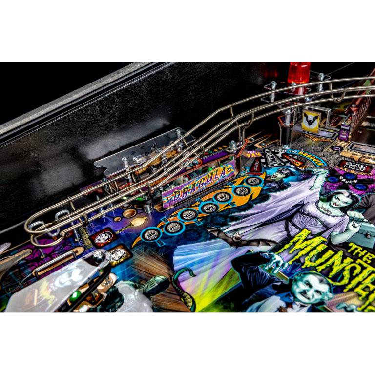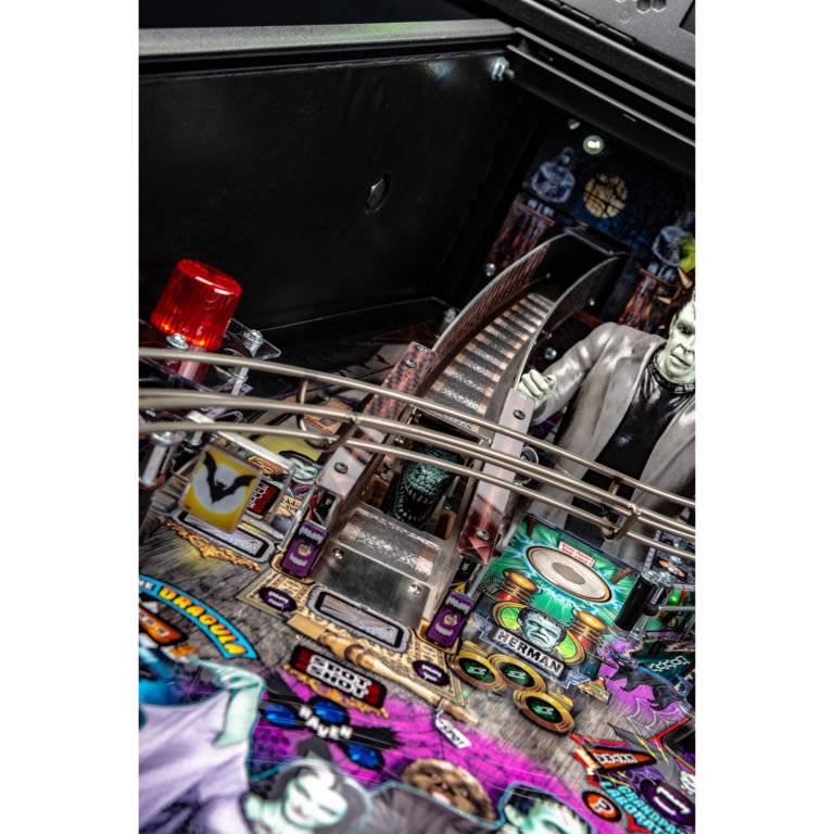 Stern’s The Munsters Pro, Premium, and Limited Edition models feature stunning and distinctive hand-drawn art. Each game features a custom sculpted Herman bash toy with magnetized ball catch, highlighting Herman multiball. In addition, all models include a pop-up Spot bash toy hidden under the left ramp, a custom sculpted Drag-U-La toy car featured near a left shooter lane kicker, as well as a metal turn-around, flip-up ramp.
